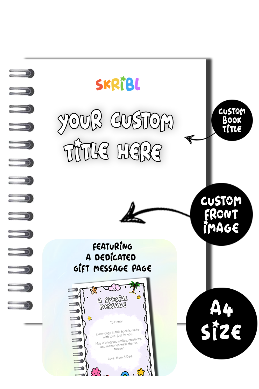 Using our online design form you can personalise your SKRIBL book to your exact specification to make it truly unique! Pick your cover title name, colours and whether you would like your book softback or hardback! SKRIBL even lets you pick a custom front image and fill out a personalised dedication page if the book is a gift for someone special.